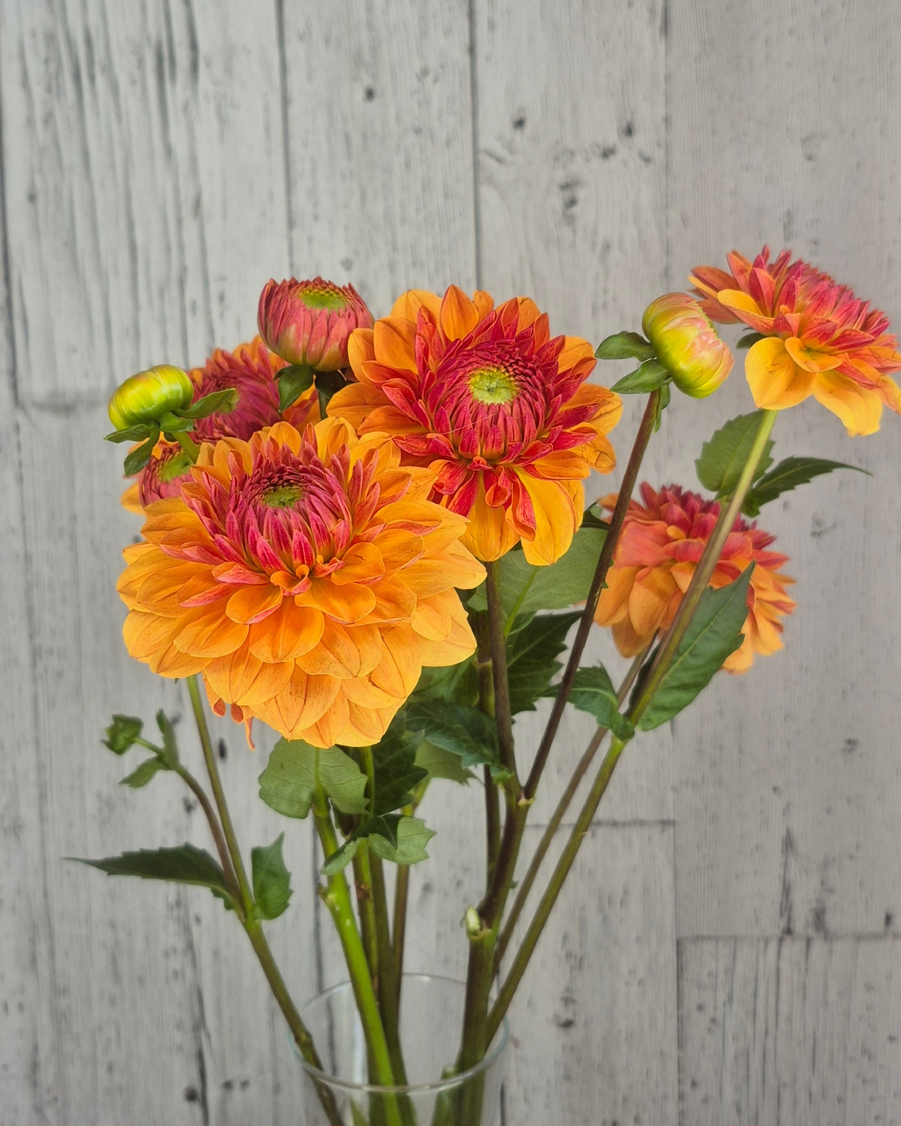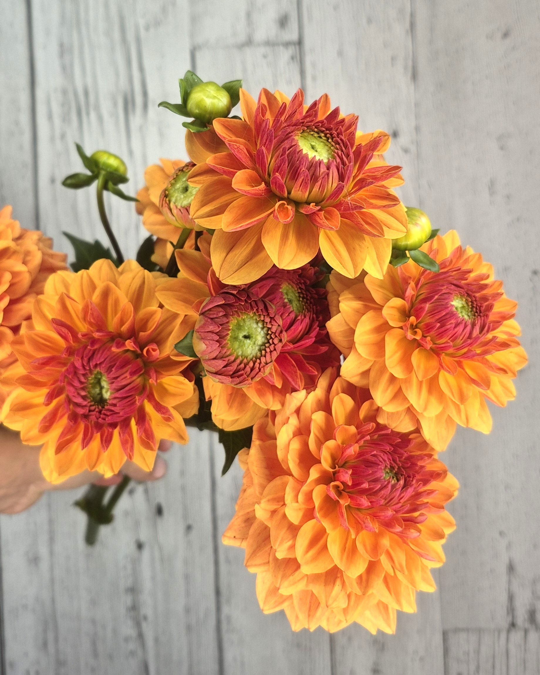 Caramel is a vibrant decorative dahlia with a rich autumnal palette. Its buttery orange outer petals blend into ruby-red centers with subtle green hints, creating a warm, eye-catching bloom perfect for bouquets and garden display.