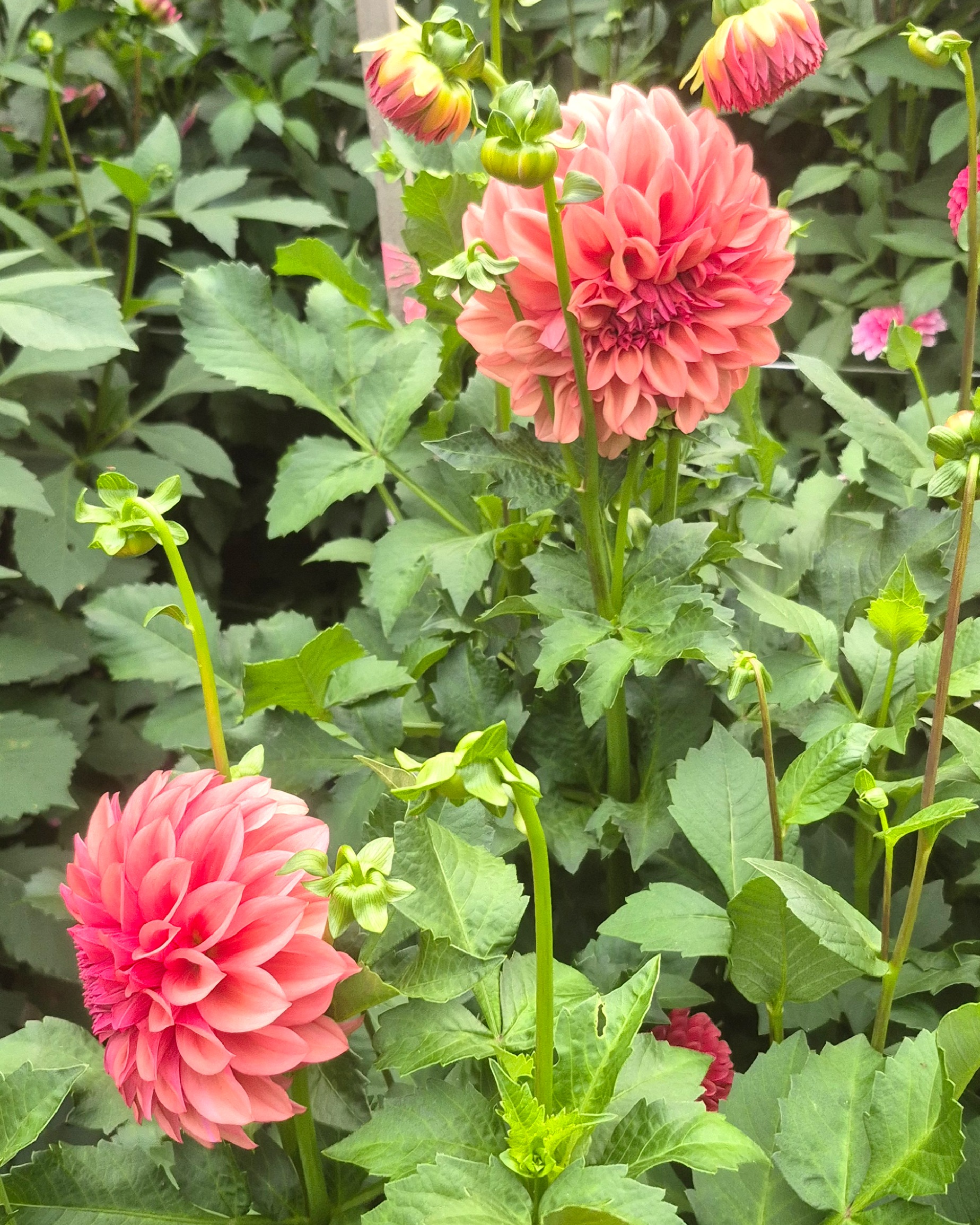 Dahlia Orange Globe is a show-stopping decorative dahlia known for its sculptural, high-petal blooms. The flowers open wide, displaying a soft dusty rose color enriched with subtle bronze highlights. Each petal curls backward toward the stem, forming a perfectly spherical blossom that sits boldly above strong, upright stems.